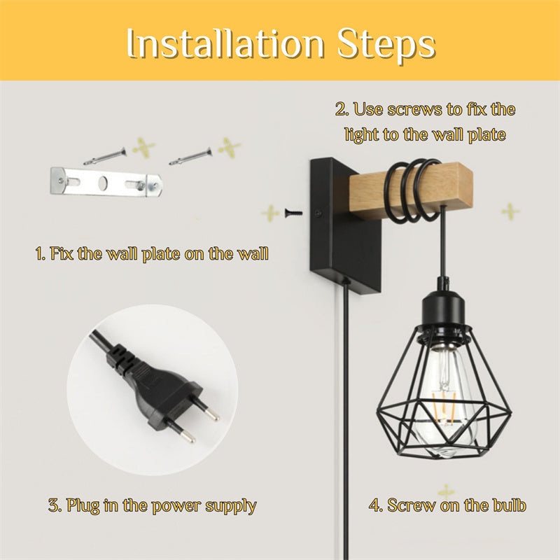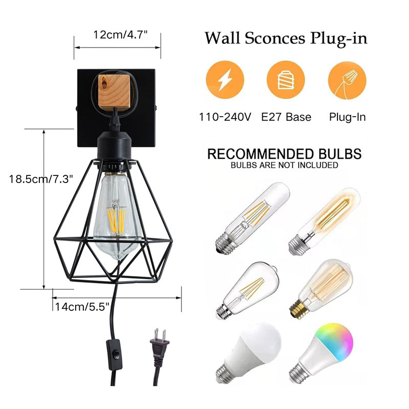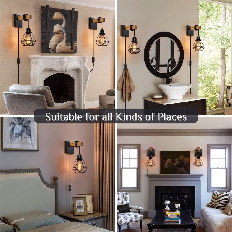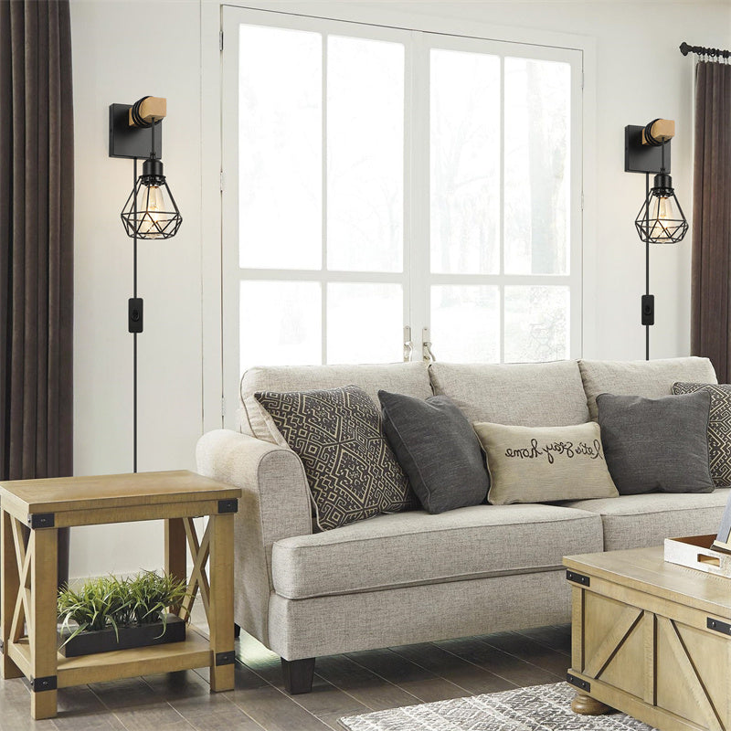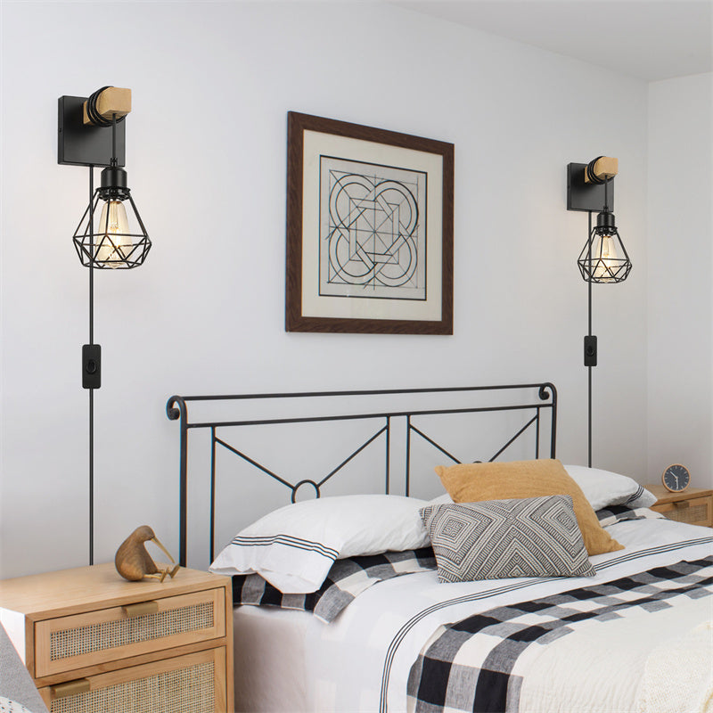 This plug-in wall light features a wall-mounted design and metal base with a matte black finish for an attractive look. The solid wood material and diamond cage shade make these plug-in wall lights a great decorative lighting choice, perfect for adding a touch of color to your home.